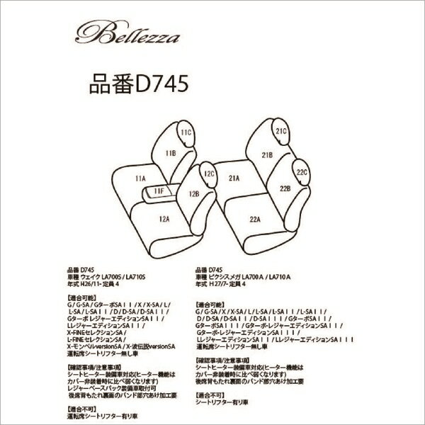 (適合可能)【型式】LA700S/LA710S ウェイク【年式】H26/11-【定員】4人【グレード】G/G-SA/GターボSAII/X/X-SA/L/L-SA/L-SAII/D/D-SA/D-SAII/Gターボ レジャーエディションSAII/LレジャーエディションSAII/X-FINEセレクションSA/L-FINEセレクションSA/X-モンベルversionSA/X-波伝説versionSA/運転席シートリフター無し車【注意事項】シートヒーター装備車対応(ヒーター機能はカバー非装着時に比べ弱くなります)/レジャーベースパック装備車取付可/後席背もたれ裏面のバンド部穴あけ加工要【適合不可】運転席シートリフター有り車(適合可能)【型式】LA700A/LA710A ピクシスメガ【年式】H27/7-【定員】4人【グレード】G/G-SA/X/X-SA/L/L-SA/L-SAII/L-SAII/D/D-SA/D-SAII/D-SAIII/GターボSAII/GターボSAIII/Gターボ-レジャーエディションSAII/Gターボ-レジャーエディションSAIII/LレジャーエディションSAII/LレジャーエディションSAIII/運転席シートリフター無し車【注意事項】シートヒーター装備車対応(ヒーター機能はカバー非装着時に比べ弱くなります)/後席背もたれ裏面のバンド部穴あけ加工要【適合不可】シートリフター有り車□サイズ(cm)WxDxH:66x53x37□重さ(kg):10ご購入前に、車両型式、エンジン型式、駆動方式、年式、グレード、シート形状等をご確認頂き、メーカーHPで車両適合に誤りがないか必ずご確認下さい。